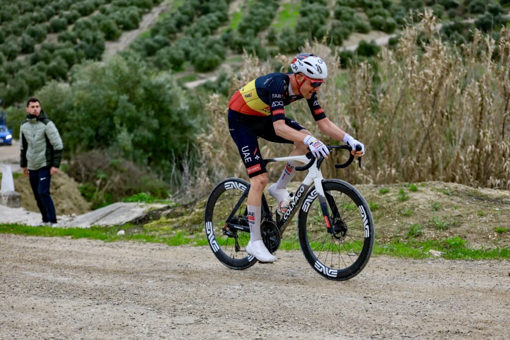 La Clásica Jaén, souvent surnommée la Strade Bianche espagnole, propose plus de trente kilomètres de chemins non asphaltés à travers l’Andalousie. Wellens n’a pas attendu les secteurs en gravier pour faire la différence. À environ 64 kilomètres de l’arrivée, il a placé une accélération tranchante… sur l’asphalte.
