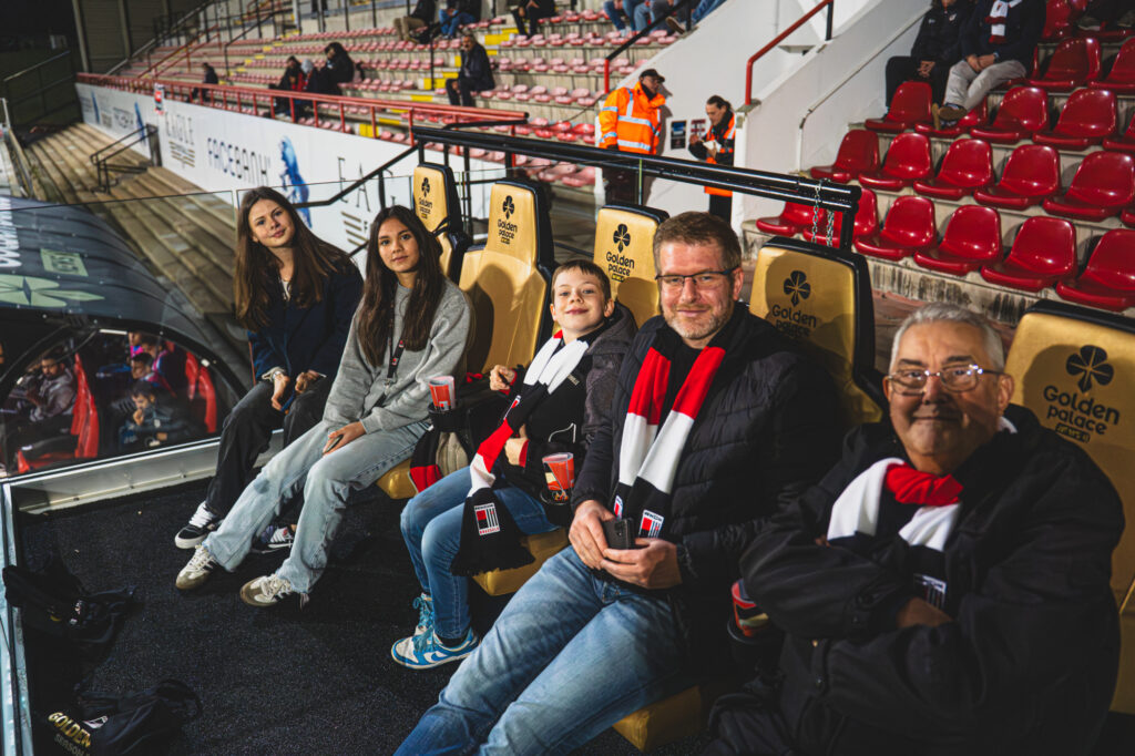 Een frisse herfstavond in Molenbeek, het Stade Edmond Machtens vol verwachting, en vijf supporters kregen een primeur‑plek: recht tussen de dug‑outs, op de Golden Seats — luxe en intensiteit in één.