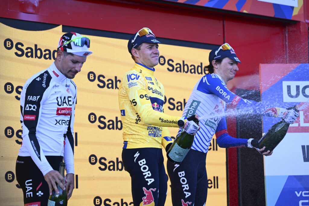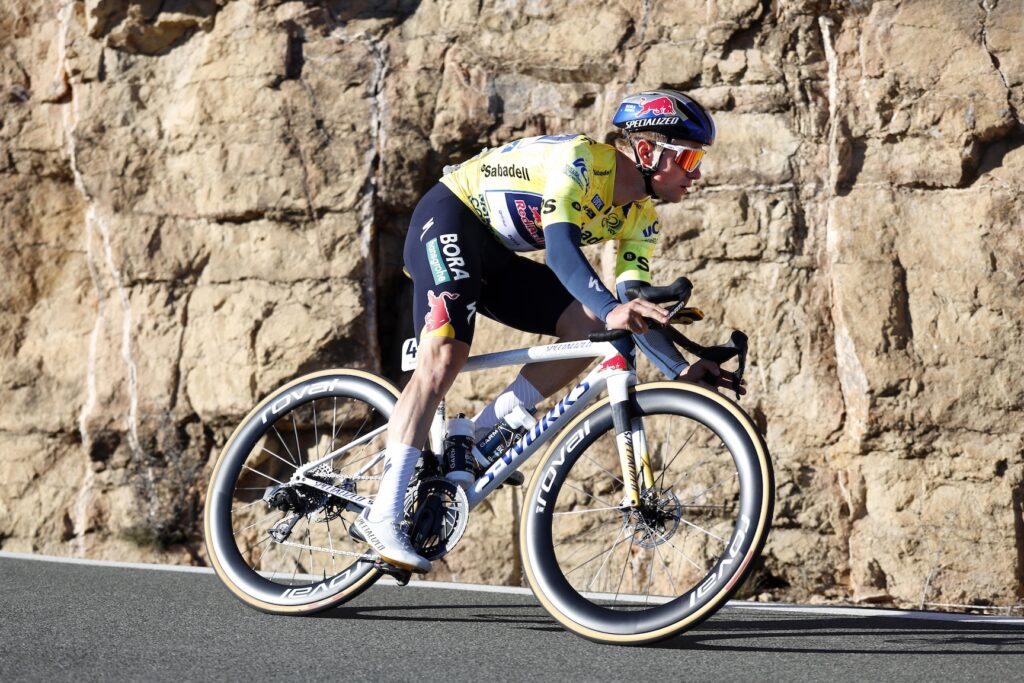 Het was verwacht: Remco Evenepoel heeft zijn Ronde van Valencia perfect afgerond. Zondag, tijdens de vijfde en laatste etappe tussen Bétera en Valencia, beheerde de Belgische leider zijn wedstrijd zonder onnodige risico’s te nemen en stelde hij zijn eindzege veilig. Een beheerste prestatie die een week bekroont die met brio werd afgewerkt in de kleuren van zijn nieuwe ploeg Red Bull-BORA-hansgrohe.